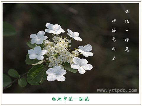 瓊花為揚州市花,自古以來有“維揚一株花,四海無同類”的美譽。瓊花是我國特有的名花,文獻記載唐朝就有栽培,瓊花的壽命較長,揚州大明寺內一株清朝康熙年間種植的瓊花,已有300多年的歷史,如今依然繁茂,風姿如故,風韻仍不減當年。它以淡雅的風姿和獨特的風韻,以及種種富有傳奇浪漫色彩的傳說和逸聞逸事,博得了世人的厚愛和文人墨客的不絕贊賞,被稱為“稀世的奇花異卉”和“中國獨特的仙花”。